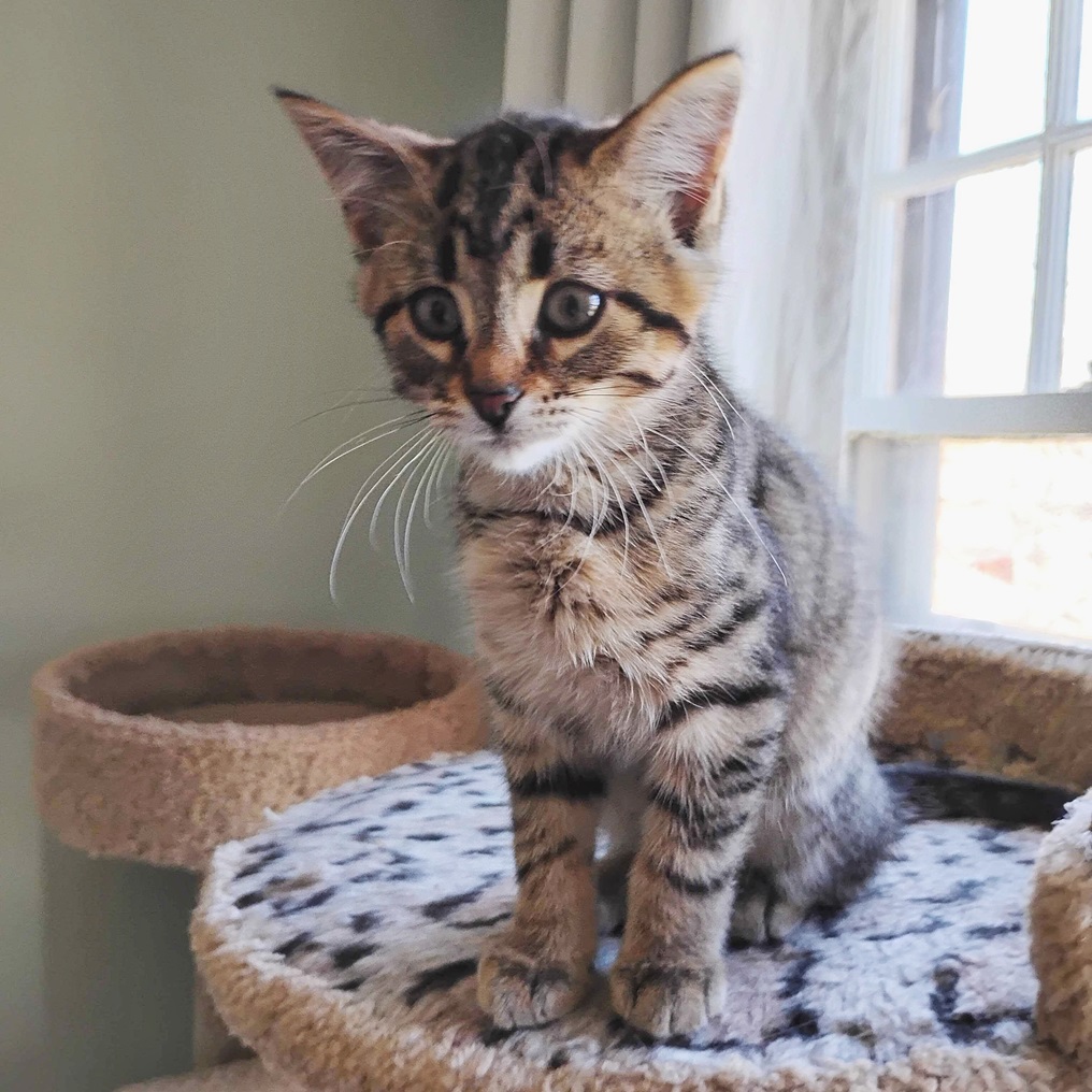Felicity is part of a litter of kittens that was surrendered to EHS along with their mom, Carina. They were a surprise addition to a group of adult cats coming from a multi-cat home. Felicity and her two sisters have been dubbed “The Three Musketeers,” so perhaps it is fitting that this tabby trio all wear a distinctive “M” (that all tabbies have) on their foreheads.